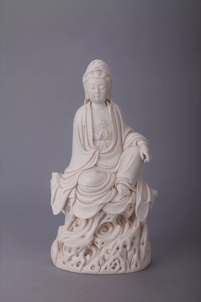 明代德化窑在元青白瓷的基础上发展到一个新的历史高峰,这种特殊的“白瓷”——瓷质致密,胎釉纯白、浑然一体、洁润滑腻、如脂似玉,整体晶莹剔透、叩击如磬,其釉色纯净,釉面晶莹光亮,乳白似象牙,美不胜收,进一步将追求玉器质感的完美性发展到历史的巅峰,代表了当时白瓷生产的最高水平,有“象牙白”、“猪油白”之美称,西方则称之为“中国白”(Blanc de chine)、“世界白瓷之母”。
