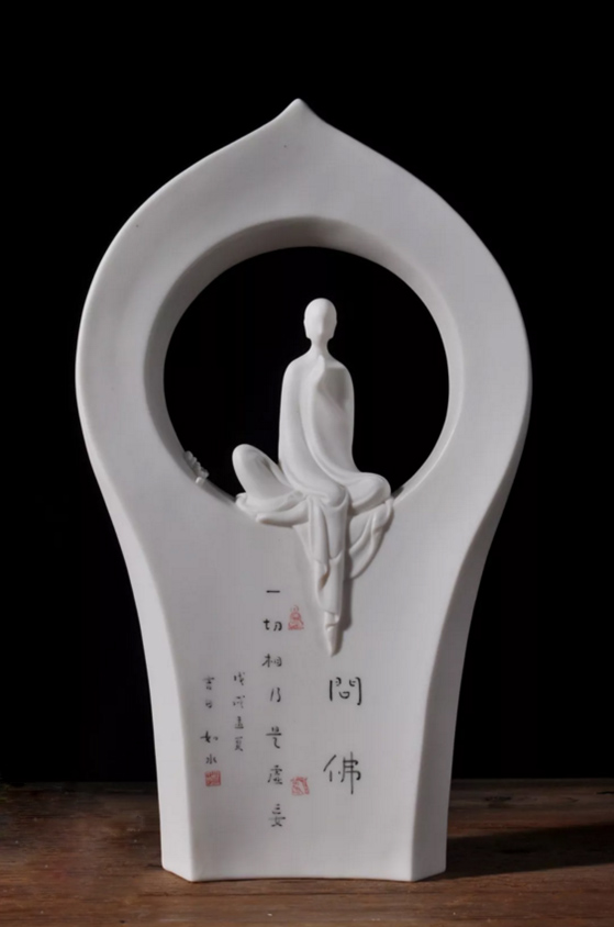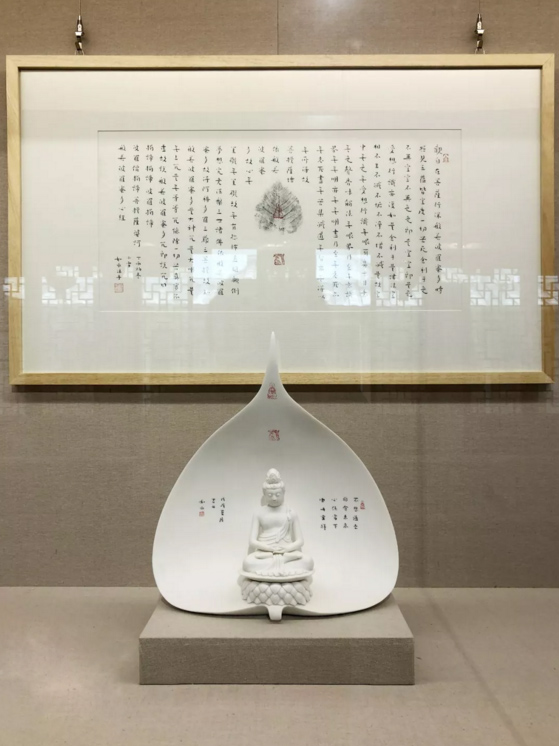 陶瓷与书法都是中华民族的传统艺术。陶瓷是泥与火的艺术,书法是笔含墨的艺术。从本质来讲,两者有相通之处,有着许多共同的文化内涵和相通的艺术特征。德化白瓷具有胎体致密、透明度高、釉色洁白、温润细腻、凝脂似玉的特点。展品便充分利用书法的形式美和德化白瓷这种材质美以及在文化内涵上的联系,和谐而自然地结合。
