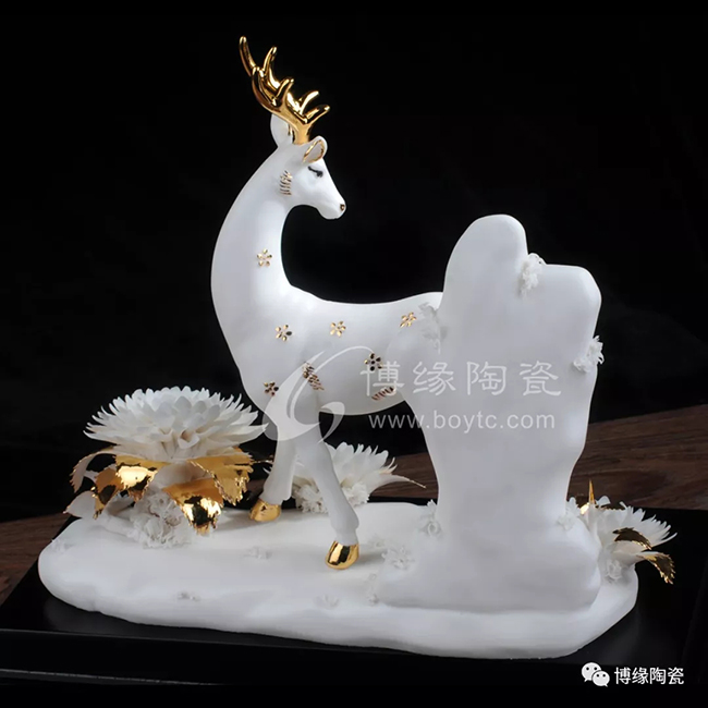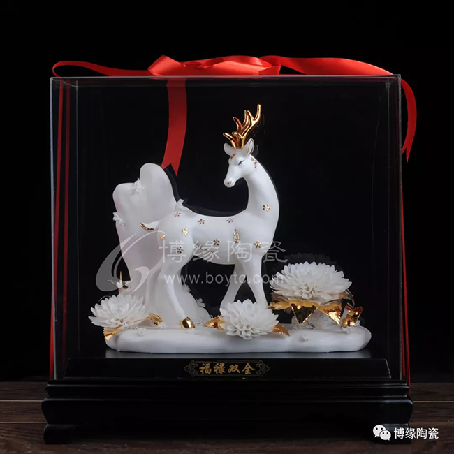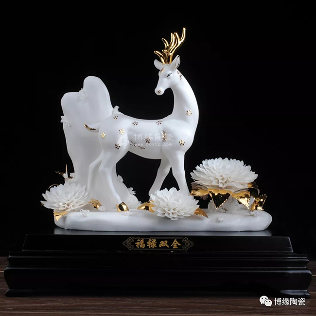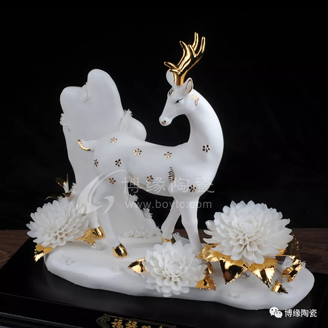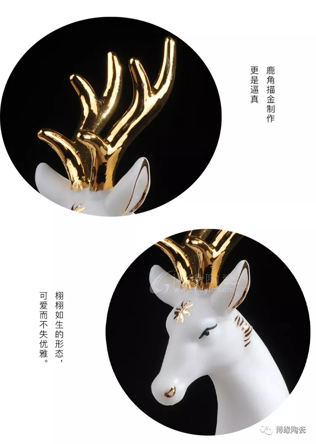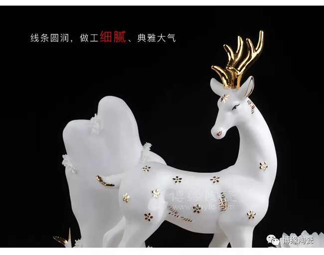该作品纯手工打造,所塑鹿神态逼真,造型优美,以描金工艺体现作品高贵,以手工瓷花作为配饰,使作品更精细,富有现代家居美感,透露出时尚简约的气质,是送礼礼品和家居摆件的极佳选择。