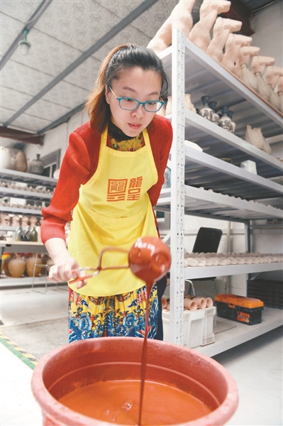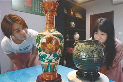 说自己的经历,孙天舒很动情感:“很多人说我选择了一条最难的路,的确与泥料为伴的日日夜夜中,我经历了常人难以忍受的苦。”经过一番努力,孙天舒在关涛教授指导下,根据辽瓷断代前的造型工艺,恢复出制瓷工艺的流程,包括练泥、拉坯、印坯、利坯、晒坯、刻、划、剔、素烧、点彩、施釉、釉烧等。在造型方面,依据契丹族辽瓷的独有器型,进行1:1等比例恢复,包括凤首瓶、皮囊壶、宝葫芦、交颈鸳鸯壶、鸡腿坛、摩羯壶、鱼形壶、马蹬壶等。“做一批作品需要三四个月,幸运的话能出一件成品,有时候几百件里出一件,可谓‘百里挑一’。”