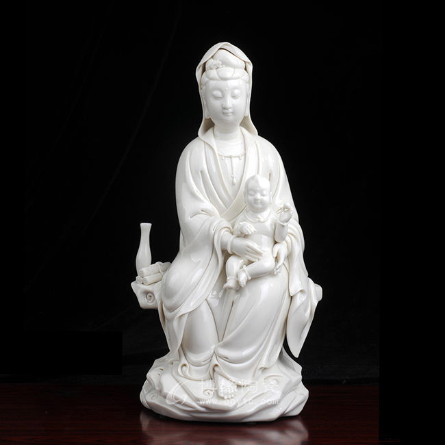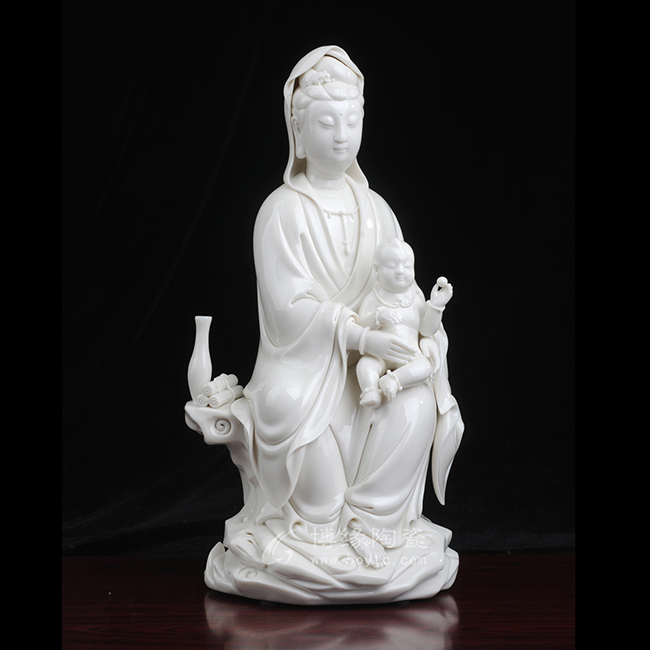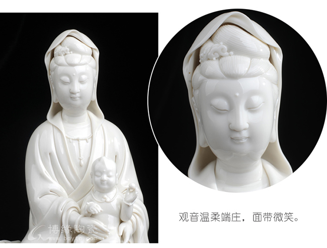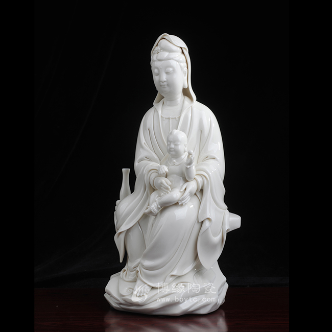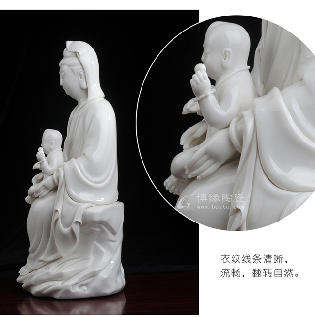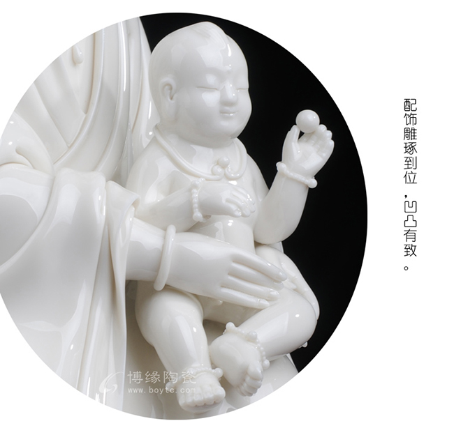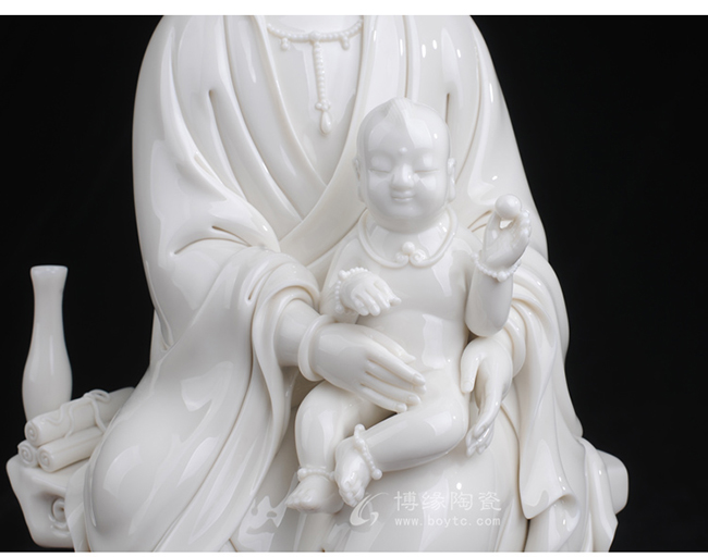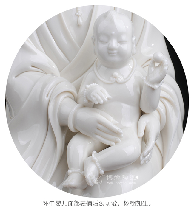 观音着袒领宽袖衣,胸前饰串珠整件雕塑衣褶层次清晰,自然舒卷,流畅飘拂。怀中婴儿微带笑意,手拿小圆球,活泼可爱。