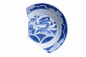 再看那条腾身拱背、张牙舞爪的龙,显然是一条成年“苍龙”。在明代,“苍龙”属于民窑瓷器禁止使用的纹样,一般只能在官窑瓷器上看到它的形象。明代官窑纹样中,有“海水苍龙捧八卦”等品种,与本文附图上的龙纹十分相似。