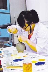 陶瓷修复工作不仅讲究细心、耐心,更讲究对美学的认知,对色彩的掌握,因此,曹元元认为,“上色”算得上是过程里最难的一个步骤,“瓷器外面有一层玻璃质感的物质,釉面大概这么厚,我们上色首先要把器物填平,平了之后底下的这层颜色,先把它上出来,最后一点点上玻璃质感这一层。每一层都非常薄,厚度是一层一层堆积出来的。中间如果你有一笔出错的话,就要把之前全都洗掉再重新来”,在她看来,文物修复除了专业知识,美学的功底更是必不可少,正是因为长期画画的缘故,曹元元对颜色极其敏感,上色的技巧也是颇有心得。