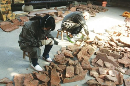 “当我们从放置于文物库房的塑料编织袋中取出陶棺碎片的时候,发现大部分碎片已经严重受潮,酥粉,一些碎片由一块又裂成数小块,原本有上千块的碎片就变得不计其数。”曹元元告诉记者,最小的碎片只有指甲盖那么大,她和老师要做的就是把这些指甲盖大小的碎片拼接、复原,但这还不是最难的地方。