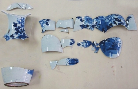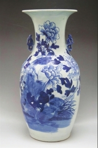 光绪青花雉鸡牡丹纹瓶修复前的样子。