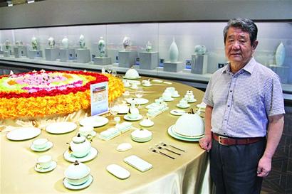 “这就是在刚刚结束的上合组织青岛峰会上各国元首们使用的陶瓷餐具,它的名字叫‘千峰翠色’,一套有56件陶瓷器具组成。”何岩说。从16岁进入淄博淄川陶瓷厂工作以来,65岁的他已经和陶瓷打了近50年的交道,看着自己设计的陶瓷器具一次次走进国宴现场,何岩感到由衷的自豪。