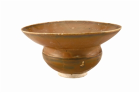 北宋定窑酱釉瓷渣斗(图2),高9、口径18.5、底径6厘米,为碗口鼓腹罐的复合体。碗(图3)为大敞口,斜弧腹;罐为扁鼓腹,浅圈足。渣斗为卫生用具,用于盛装唾吐物,也用于酒宴上盛放肉骨鱼刺等食物渣滓,与唾壶相似,当为唾壶演变而来。其实用性在保持原有的功能的同时,兼有茶器的功用。2006年至2009年,陕西省考古研究院、西安市文物保护考古研究所对蓝田县五里头村北宋吕氏家族墓进行发掘,出土了数十件渣斗,在一件铜质的渣斗内发现残留的茶叶,从而推断,这件铜质渣斗是一件茶器,是用来盛放茶渣的。