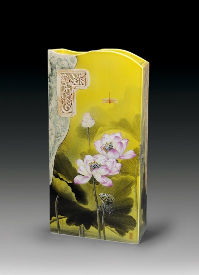 《荷和美美》是景德镇学院陶瓷美术与设计艺术学院的黄萍教授300件镶器“庭院系列”的经典之作,这是她自创的一种具有多元表现形式的花鸟瓷绘艺术,其特点是在设计好造型的坯体上,运用多种高温颜色釉的肌理效果,通过堆、雕、镂、划等手段,将江南民居中常见的三雕艺术(石雕、木雕、砖雕)与老墙、瓦当等元素完美地融为一体。《荷和美美》右上角皆以颜色釉仿出墙纹肌理,配有花卉纹,“莲莲有鱼”等镂刻的祥纹,经典的江南民居元素尽在眼前,仿佛置身池畔的小屋内透窗赏莲,绿荷满窗。画面以明黄为背景色,散发着明媚与阳光的气息,池内碧叶连天,娇莲亭立,悠悠荷香中蜻蜓轻舞,一派生趣盎然,美不胜收。黄萍教授笔力精巧,刻画有致,线条工细而不呆板,敷色艳丽而不浓腻,光彩奕奕,栩栩如生,荷花的叶脉甚至纤维也用细笔毫发无遗地勾出,整个画面显得气闲神静、恬润温雅,笔调清新,装饰趣味浓郁。