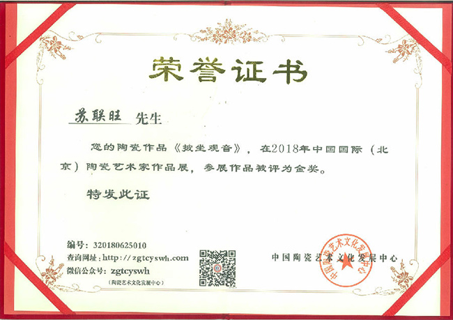 2018年6月,作品《披坐观音》荣获2018年中国国际(北京)陶瓷艺术家作品展评比金奖;