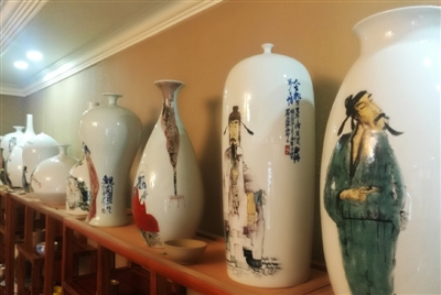 从大到抱着都吃力的戗器、花瓶,小到只有鸭蛋大的盖碗、酒杯,琳琅满目、形态各异,仿佛一个小型的瓷器博物馆。“这些大部分是禅意人物主题。”杜高密介绍,还有一些没摆出来,如水浒108将系列瓷器,创作了4个月才完成。这些瓷器并非买来的收藏品,从制坯、绘画、上釉、到最后的烧窑,每一道工序都出自杜高密之手,“家里大概有600多件吧。”