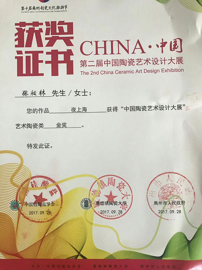 作品《夜上海》荣获“第二届中国陶瓷艺术设计大赛”金奖