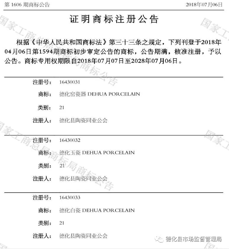 日前,“德化白瓷”“德化玉瓷”“德化窑瓷器”获国家工商总局商标局核准公告,成功注册地理标志证明商标 ,是继“德化陶瓷”“德化瓷雕”之后我县陶瓷产业又获批的3个地理标志证明商标,将对提升我县陶瓷产业的知名度、美誉度和影响力,提升产品附加值,促进陶瓷产业跨越发展起到积极的推动作用。至此,我县共有6件地理标志证明商标,居全市第2位!