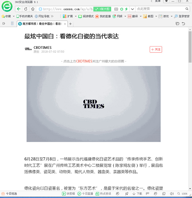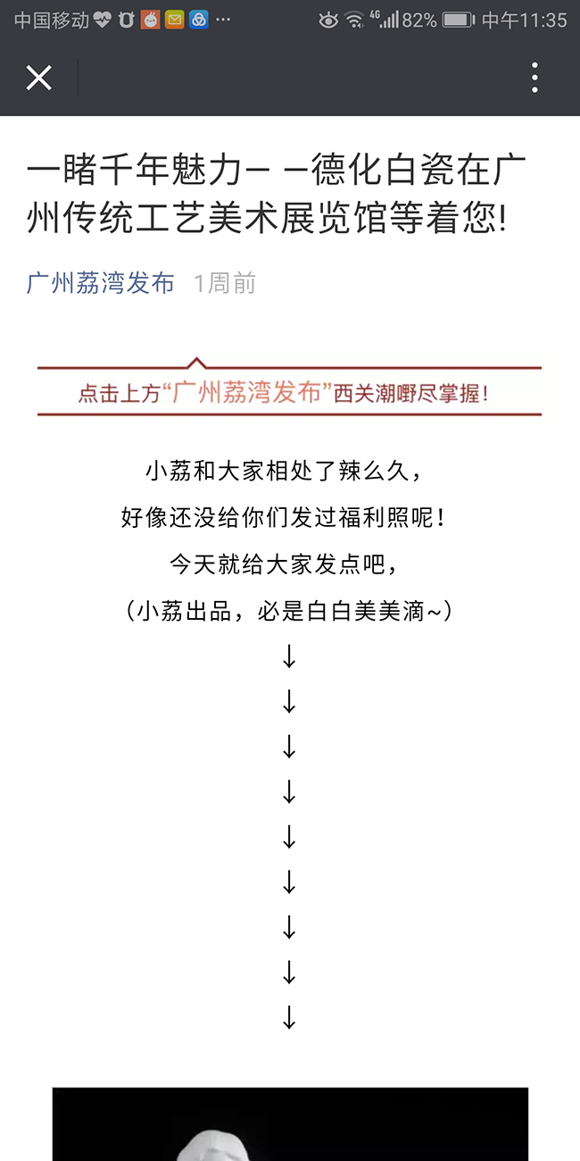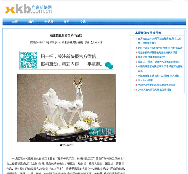 6月28日至7月8日,福建德化白瓷艺术作品展在广州传统工艺美术馆拉开序幕;本次展会由广州传统工艺美术馆与中华陶瓷网、博缘陶瓷联合举办;本次展览汇聚当代德化20多位艺术家的80多件作品,当代青年陶瓷艺术家柯维太携作品《渡海观音》、《披坐观音》、《招财纳福》、《笑口常开》亮相展览。