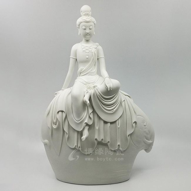 德化白瓷所塑佛像有性格鲜明、造型优美、神态逼真、风格洗练的特点。有一种单纯的雕塑美和原材料的质地美,最能体现佛教朴素、平和的思想。早在明代德化白瓷佛像就名声在外,一代“瓷圣”何朝宗佛像名作流传后世,成为世界各大博物馆收藏的珍品,更对佛像雕塑史上产生深远的影响,形成“何派”雕塑,其开创的捏、塑、雕、刻、刮、削、接、贴八字技法延用至今。何派观音雕塑注重于细节之美,精益求精,故而十分着意衣纹的刻画,使线条流畅,翻转自然。观其佛像,仿佛有春风拂面,衣袂飘扬的出尘之感。