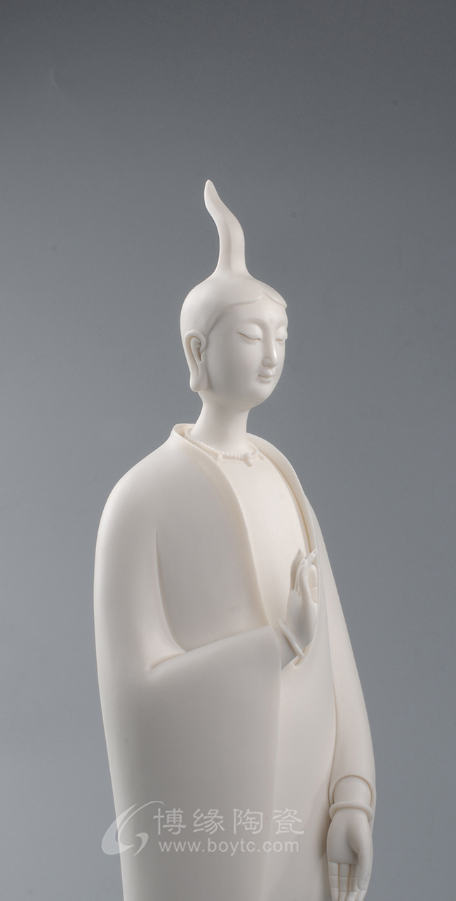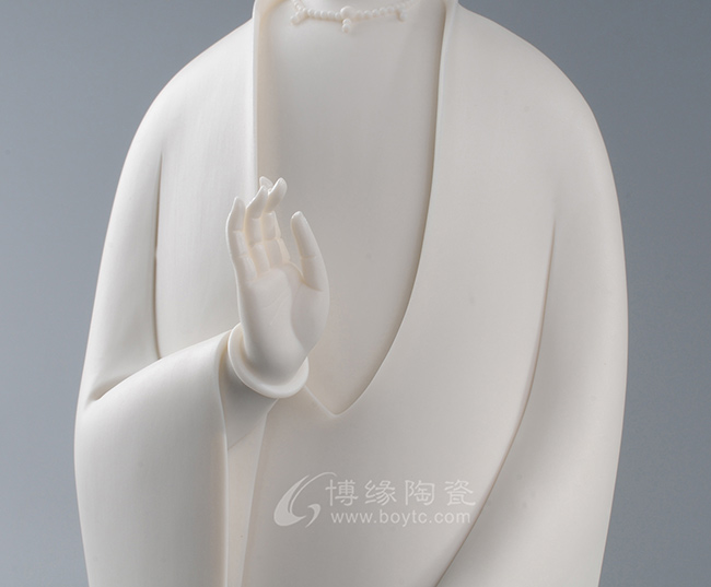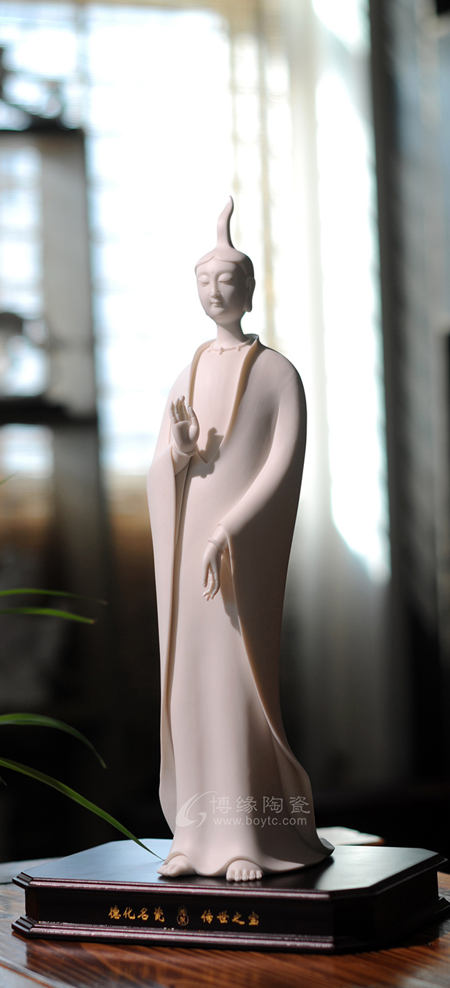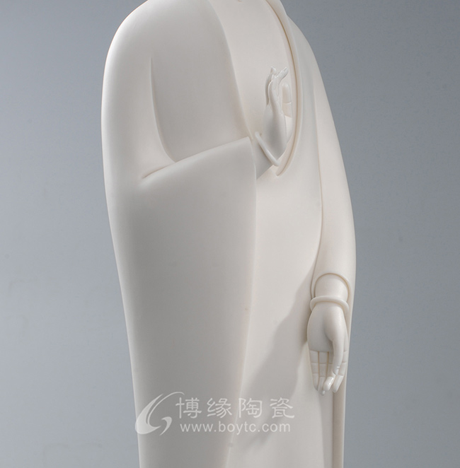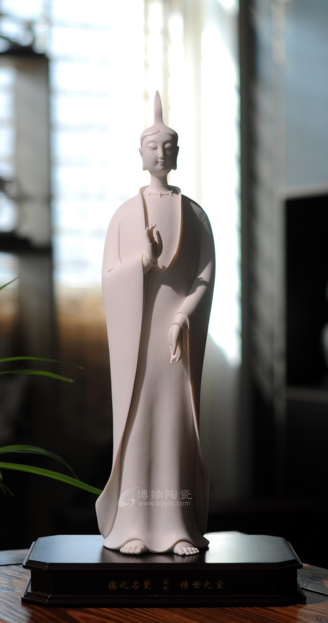 作品既保持了德化传统白瓷的烧制工艺,许多细节也更有了现代的审美特点,适合作为禅意空间摆件。