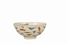“洪福齐天”,多只红蝠与祥云组合。雍正款洪福齐天纹碗(图5),高4、口径9.7、底径3厘米。口微敞,圈足,足内有“大清雍正年制”双行楷书款。器腹上绘满天飞舞的红蝙蝠,间以云朵纹。以红色的蝙蝠谐音“洪福”,蝙蝠飞行于云朵间,象征洪福之高与天等齐,故称洪福齐天。