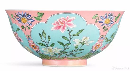 清康熙 御制粉红地珐琅彩开光花卉碗 直径14.7cm