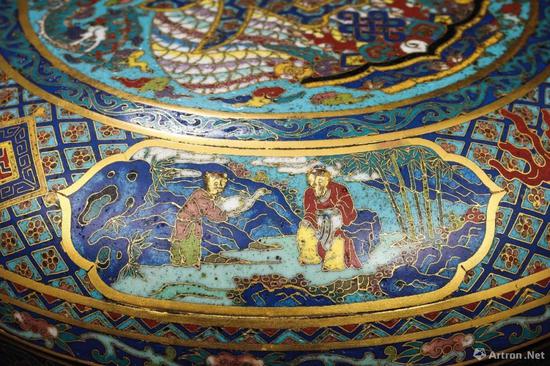 用源自欧洲的华丽多彩的珐琅彩料,表现中国传统的文人故事,体现了十八世纪清代宫廷所喜爱的视觉艺术形式。这类艺术作品是中西文化融合后的产物,是那个时代特有的艺术成就