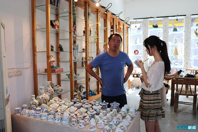 8月4日上午九点,实践团队来到了位于景德镇雕塑瓷厂的乐天创意集市。这里的瓷器在器型上和博物馆中的古代瓷器大同小异,但是仔细观察上面所刻化的图案则有一种现代艺术的气息,所展示的内容和主题也同古时的有所差异。店家热情地向学生介绍着店里面这些瓷器的有关情况,店家自豪地介绍这种种瓷器究竟哪里美丽,哪里独特以及其所蕴含的价值。店家是位资深行家,他兴奋地向学生展示摊位上的瓷器,瓷器非常有特点,瓷器上的图案近看是几何图像的汇集,远看又像是传统的山水画。并表示,他的瓷器是描金青花瓷,上面的图案既结合了西方点、线、面的几何图形原理,又融入了中国山水画的朦胧意境,正是两者的和谐统一,使得他的瓷器销量达到每月万余套。