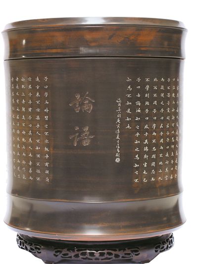 像获得2010年中国工艺美术“百花杯”金奖的《步步高》茶叶罐就很能体现吴莹的文化底蕴。在造型上,作品以一节竹子为创意,同时刻印最能代表中国文化智慧的《论语》节选,盖子上则是瓦当文。“作品命名来自粤曲《步步高》,是今天人民物质文化生活不断前进的见证。”