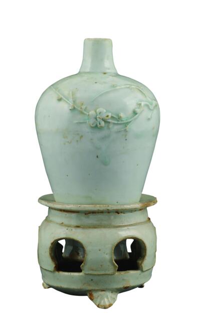 江西省博物馆收藏的瓷器珍品中,有一件精美的元代梅瓶(见图)。瓶体不大,通体施青白釉,高19.5、口径2.6、足径6.5厘米。此瓶还带有一座,座高9.4、口径11.5、底径6.5厘米。瓶、座安放一体后通高24.7厘米。