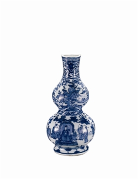 该器体积庞大,是壁瓶中的佼佼者。通体以青花为饰,青花发色蓝艳,层次分明,画面布局饱满。口下饰一周回字纹。颈部开光,绘团龙纹。上腹部,绘青花太湖石、树木花草。下腹部绘人物。画面中间一人,端坐高背椅上,手执灵芝,头戴发冠,道骨仙风。四周站满了着官服的人。画面似乎是在描绘明朝“道君皇帝”嘉靖帝的故事。