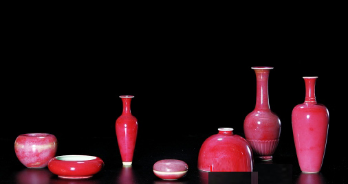 玫茵堂藏瓷以其富庶精美,在国际上享有盛誉。此次展出一套豇豆红文玩瓷器七件套,产于大清康熙年间,包括镗锣洗、莱菔尊、太白尊、印盒、菊瓣瓶、苹果尊、柳叶瓶各一,色彩润泽,细巧可赏。而展出的玫茵堂文玩瓷器七件组成一套,品相完好,更为难得。