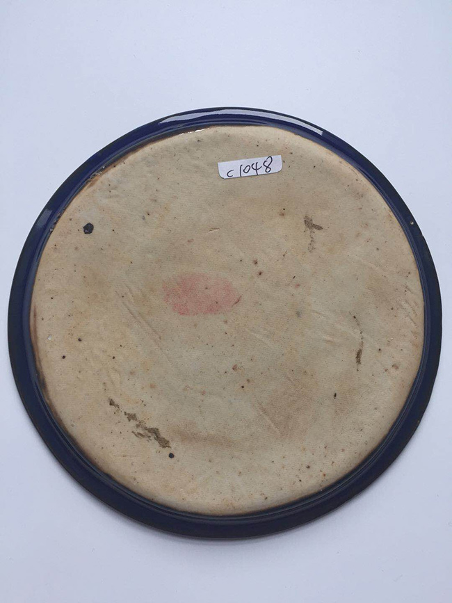 此盘属于高温钴蓝釉瓷器。以钴料为呈色剂的蓝釉的起源,可以追溯到唐三彩陶器。高温钴蓝釉瓷器则是元代景德镇发明的。采用当时稀少的进口钴料,钴是青花的呈色剂,融在釉中,即可烧成钴蓝釉,呈色十分稳定。但是色彩鲜艳的蓝釉,除釉色纯净外,尚须有洁白的胎质映衬,方能显现出蓝如宝石的理想釉色。