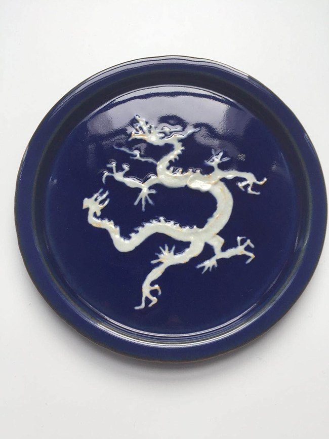 此盘折沿,浅壁,平底。通体内外施蓝釉,外底无釉。盘心坦平,在蓝釉地上以白色泥料塑贴一条矫健的白龙。龙细颈,三爪,作昂首翻腾状。它是先在素胎上刻划龙的轮廓和龙鳞;再在龙纹上直到紧边缘处施乳白釉,并用青花轻轻点出龙的眼睛;然后在纹饰轮廓线外的全部地方施蓝釉作地。