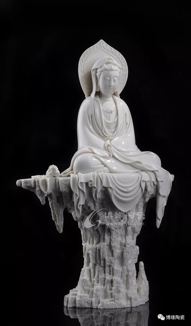 《观自在》作品以德化白瓷为胎体,瓷质温润细腻,以白瓷之纯静表现观音之圣洁,观音端坐在岩石之上,身旁置有佛珠及经书,观音头梳高髻,双目微下垂,似凝神静思,双手藏于袖,衣褶深刻 ,线条圆润流畅,翻转自然,容貌端庄、超凡脱俗、高贵典雅。
