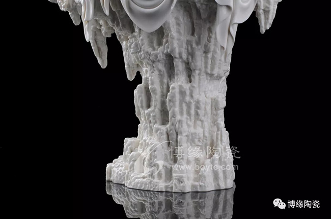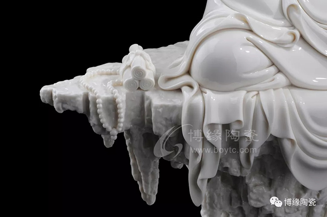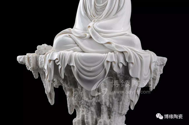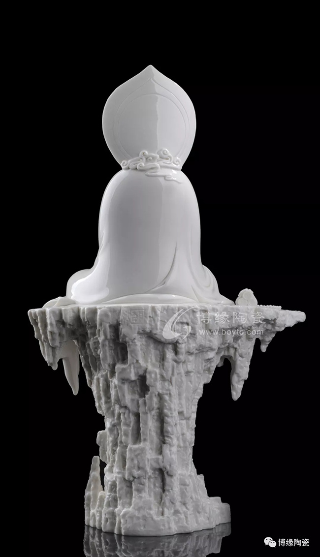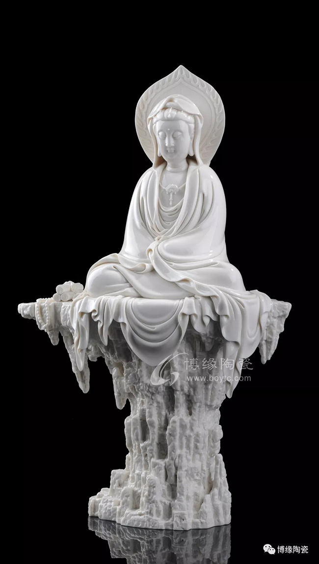 作品岩石雕刻精细且逼真,岩石凹凸奇兀,手法不落俗套,别具匠心,仿佛见观音坐立于山岩之上普观众生,作品传承明代“瓷圣何朝宗 ”的艺术手法及韵味,实属一件难得佳作。