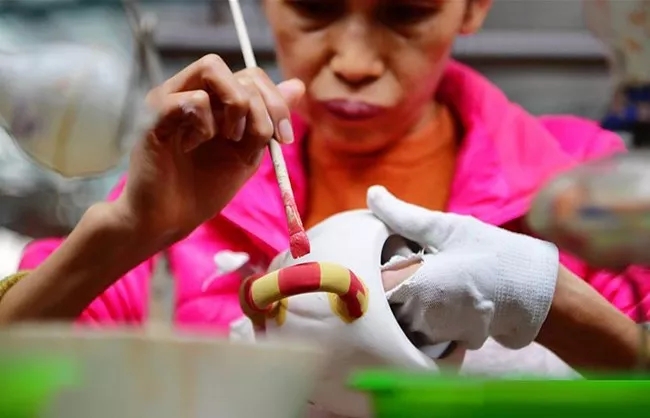 10月23日,德化顺美陶瓷有限公司工人在生产线上给陶壶上色。