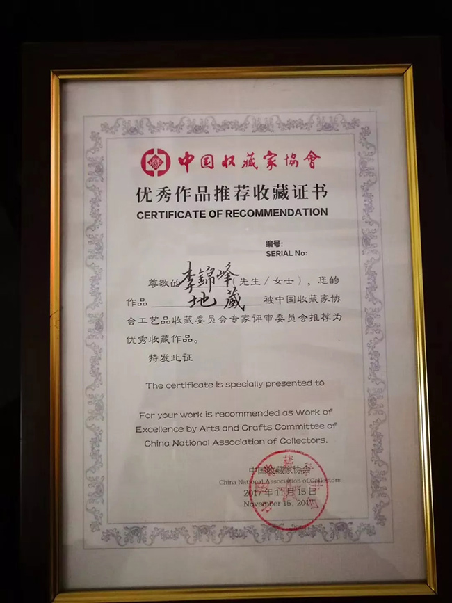 2017年11月《地藏》被中国收藏家协会工艺品收藏委员会推荐为优秀收藏作品