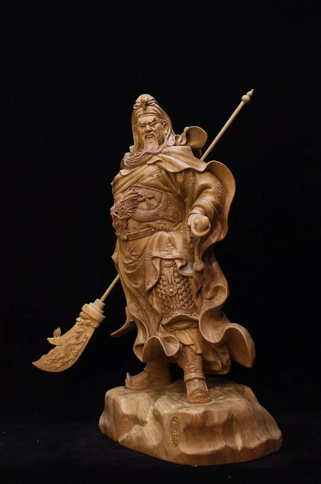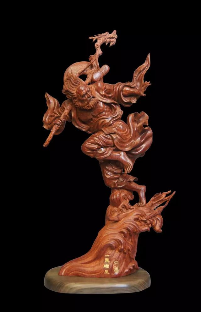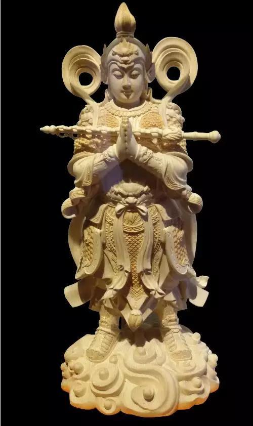 作品展示了朝天韦陀气定神闲的面目,呈现出得道之后清逸的神情。他双手合十,面目祥和,手持金刚宝杵头戴凤翅盔,足穿乌云皂履,身披黄锁子甲,面如童子,表示对佛教怀有赤子之心,脚踩祥云呈一副祥瑞之照。