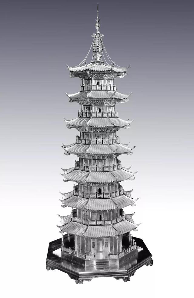 《四季五福吉祥塔》表达了对“人性向善”和“真善美”的追求。宝塔的每层都表现了不同的文化象征,作品综合了操、凿、起、解、披五大银雕传统技法,体现了超高水准的组合、焊接工艺。在局部处理上,圆雕、立体雕、微雕等技法用到极致,是一款集银雕技艺、艺术观赏性、文化传承和收藏价值于一体的经典作品。