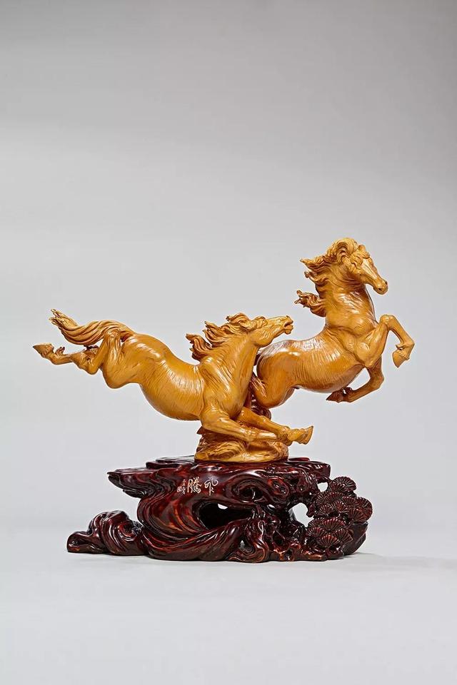 《马到成功》刻画双马奔腾,倜傥洒脱的骏马,它们或奔腾跳跃、或歪脖作态,或马足腾空而起,是自由和力量的象征,更寓意志在千里、马到成功。整件个作品双马组合,雕刻细腻、栩栩如生极其动态感与立体感。主要采用由表及里深镂细刻的镂雕技艺,并突破传统技法,使模型不经过打磨工序,从而保留原始的刀雕韵味。其作品双马代表了一种奋发向前、敏捷内秀的性格,马的忠诚、无畏和那一往无前的进取精神。