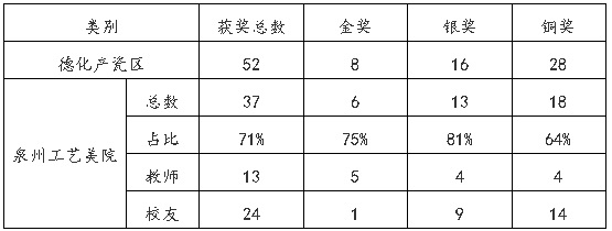 泉州工艺美术职业学院教师、校友成为德化产瓷区获奖的主力军,占据71%的获奖份额。教师邱玫瑰《游园﹒今梦》、张南章《唐太宗》、庄虹虹《希望的田野》、黄永星《何朝宗》(NO.3雕塑)、郑振雷《衣襟飘香》(8头文具)等5件作品获得金奖,邱玫瑰《园林清曲》、张丽芬《女人与猫系列》(3件)、郑振雷《当局者》、高越《畔山云海》等4件作品获得银奖,周金田《逐梦》、许庆裕《海纳百川》、梁双升《自然神曲》、陈名昭《阿尔法城考古报告》等4件作品获得铜奖。在德化报名参评的泉州工艺美术职业学院毕业生,获得1金、9银、14铜。此外,泉州工艺美术职业学院举办的国家艺术基金“白瓷瓷塑艺术创新人才培养”研修班学员,在德化学习期间创作的作品,也获得1金、1银、4铜的好成绩。