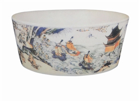该缸尺寸硕大,口径60.5厘米。更为难得的一是画意典雅,二是斗彩。缸体通身绘海屋添筹图,画面上绿波荡漾,祥云绕华屋(瑶台),并有仙鹤衔筹向吉人飞来,一派鸿运高照景象;而斗彩品种,旧古玩行有斗彩皆官窑之说。虽然此说未必客观,可斗彩的身价确实很实在,即斗彩高于五彩,五彩贵于青花。