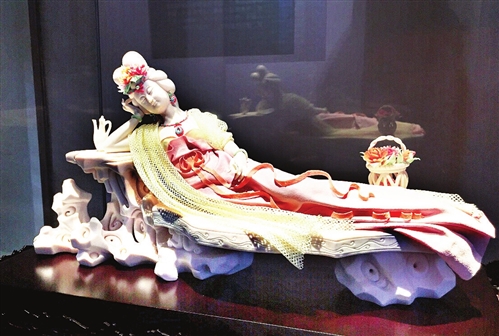 记者在现场看到一件山花陶瓷作品《贵妃醉酒》,只见贵妃斜卧,身披网纱,衣带飘飘,精致动人。这件作品的作者是德化高级工艺美术大师郑雄文先生的弟弟郑雄彭先生。他告诉记者,贵妃身上的网纱和头上的牡丹,很多观众会觉得是塑料制作的,其实,她通身都是陶瓷,且所有的颜色是烧制出来的,而不是后来加彩,这正是山花彩的独特工艺。