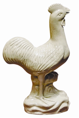 “鸡”作为吉祥、富足的象征,千百年来在中国传统文化中占据着重要的角色。人类将美好的希望熔铸在艺术品上的创作活动,几乎与人类文明的历史同步发展,这些充满了美感的艺术精品在中国的艺术宝库中占有重要位置。鸡在古代生活和宗教活动中的重要作用,也被倾注在人们的创作之中,使鸡成为古代青铜器、陶瓷、绘画等艺术品的重要题材。这件清代潮州窑白釉雄鸡(见图),就是古代窑工精湛技艺的完美体现。
