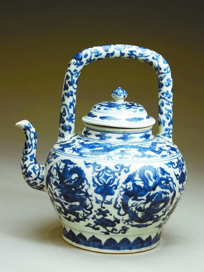 一把隆庆时期的青花团云龙纹提梁壶是本次展览的重点展品。“根据专家们的研究,同类的隆庆御窑提梁壶存世量仅在两到三把,故宫博物院仅藏一把。”冀洛源介绍,这把提梁壶与同时期的其他壶有一些区别。首先,同时期的壶一般都是壶柄跟壶流位于壶身相对应的两侧,而这把青花瓷壶则是仿照宋元时期常见的提梁壶做法,将壶柄放在壶肩部。此外,与其他作为生活用器的壶不同,这把青花团云龙纹提梁壶体量很大,更可能为陈设用器。“从纹饰上看,这把壶的纹饰已经与明代中前期推崇的清雅风格不同,显现出繁缛、华丽的状态。”