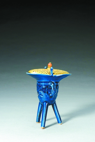 展柜中,一件故宫博物院藏的明嘉靖祭蓝爵杯与一件景德镇御窑厂遗址出土的涩胎爵杯残片标本呼应展出,观众既可以看到精美、完整的皇家祭祀用器,也可以看到爵杯尚未上釉、“素面朝天”的样子。“上过釉的瓷器,有时会遮掩了器物原有的纹饰。从这件还没上釉的标本上,我们可以看出,事实上它胎体表面的纹饰是仿照青铜礼器制作,而且还使用了‘锥拱’和‘堆塑’的工艺。只不过铺在表面的釉层,让它们变成了‘暗纹’。”