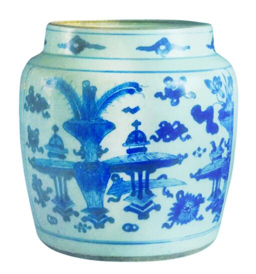 罐高19、口径14.8、足径15.9厘米。博古纹系瓷器装饰的典型纹样之一,由《宣和博古图》一书而得名。《宣和博古图》由宋徽宗敇撰、王黼编纂,著录北宋皇室在宣和殿所藏商至唐代的铜器839件。后来,由于士大夫不断用以作艺术品上的装饰题材,“博古”的含义遂被引伸,凡绘以鼎、尊、彝、瓷瓶、玉件、书画、盆景等物的图案,均称“博古”。
