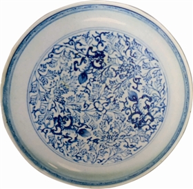 首先,是背景中的缠枝莲图案。缠枝莲纹是我国传统瓷器装饰纹样之一,明清时期尤为盛行。因其图案花枝缠转不断而得名,明代称为“转枝”。它的特点是以波状线与切圆线相组合,形成波卷缠绵的基本样式,再在空间中或波线上缀以花卉。并点以叶子,便形成枝茎缠绕、花繁叶茂的缠枝花茎纹或缠枝花果纹,它的寓意是富贵缠身。