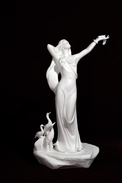 早几年前,陈桂玉就和丈夫柯宏荣一起创作过《白鹭女神》系列作品,此次国礼夫妻俩共有两件作品被选用,一件是花瓶,另一件就是《白鹭女神》。在以前作品的基础上,此次《白鹭女神》更加提升难度且加上新的创意,是件新作品。陈桂玉说,厦门又称鹭岛,“鹭岛女神”讲的是关于厦门的一个美丽传说,作品中女神半举起的一只手托举着麦穗,寓意着赠予人们播种、丰衣足食。最难的地方就是女神半举的这只手,手处于架空的状态,创作时,要先做好手举的高度刚刚好,这样女神的优美体态才能表现出来。而高举的手在窑炉的高温中烧制时,容易变形、塌。“要把手做得是向上的感觉,这样才美。”陈桂玉说,高温下的陶瓷就像麦芽糖一样柔软,掌握好女神的平衡度非常难,为此她和丈夫实验了无数次,想了很多办法,一次次调整手的高度,烧制了几十件,最后成功仅有5件。