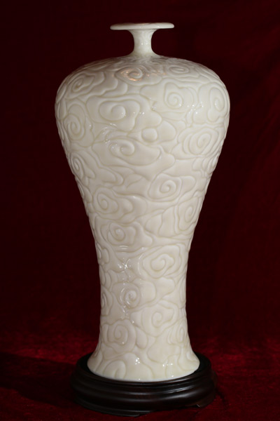 花瓶是一个祥云瓶,寓意吉祥平安,花瓶上有五彩云朵,还有浮雕,因有上釉,云朵的纹路很清晰,烧制中最怕的是跳有,祥云刻深,釉会跳,所以在做这个祥云瓶的时候,柯宏荣和陈桂玉非常的用心、细心。