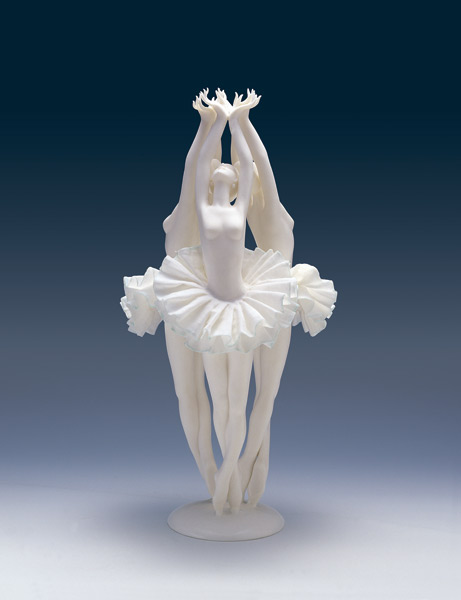 一件《天鹅湖》的作品吸引住记者的注意,三个美丽清秀的少女,身着薄如蝉翼的芭蕾舞裙,足尖轻轻一点,手指柔美舞动……绝美的艺术造型,让人怦然心动。纱裙丝丝纹路都非常清晰,让人在惊赞德化白瓷的晶莹洁润的同时,更惊叹创作者超高的技能。陈桂玉告诉记者,1993年她看到芭蕾舞剧《天鹅湖》时被深深打动,于是与丈夫数月的讨论、尝试、封存,再讨论、再尝试、再封存,于是就有了《天鹅湖》,这件作品获得首届中国工艺美术大师作品精品博览会金奖。