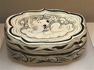 金磁州窑白地黑彩婴戏莲纹如意形枕