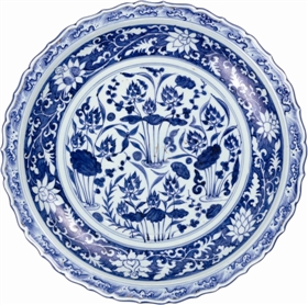 清乾隆 青花莲池清趣图折肩大贯耳壶