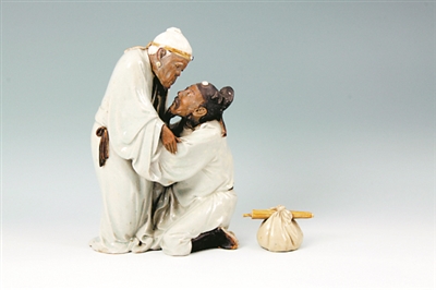 庄稼大师的这件《弃官寻母》作于1994年,高36厘米。庄稼(1931—2006年)是广东普宁人,中国工艺美术大师。1953年起师从著名陶塑家刘传学艺,献身陶艺创作五十多年。他的作品以人物为主,善于塑造文人、仕女形象,作品风格以人物形象典雅传神、衣纹流畅、结构严谨著称。代表作有《塔吉克姑娘》《唐太宗》《弃官寻母》等。